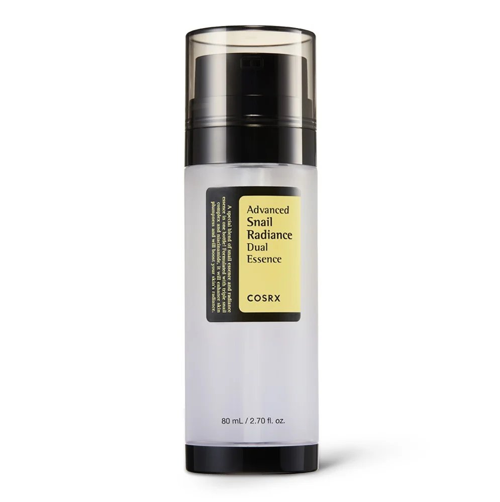 Cette double essence de COSRX contient du filtrat de bave d'escargot, de la niacinamide et de l'acide hyaluronique pour hydrater, réparer et éclaircir le teint.
