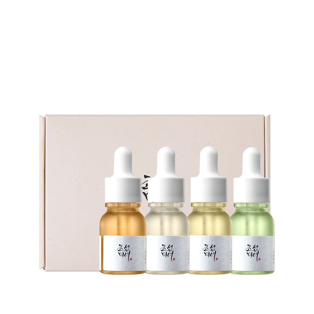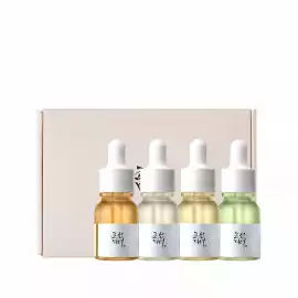 Ce coffret contient quatre mini-sérums, chacun ciblant des préoccupations de peau spécifiques.