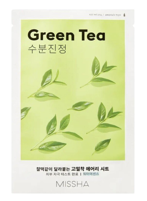 Ce masque en tissu de Missha est infusé d'extraits de thé vert, de niacinamide, d'acide hyaluronique et de caféine pour apaiser et revitaliser la peau.