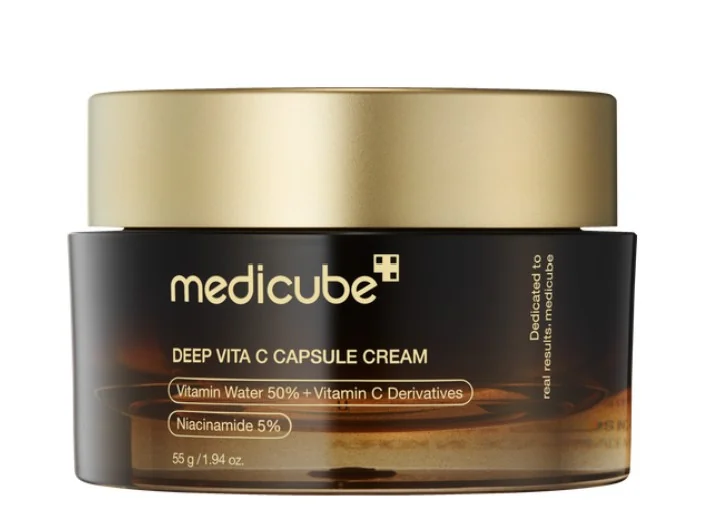 Cette crème de Medicube contient de la vitamine C encapsulée, de la niacinamide, de l'acide hyaluronique et de la caféine pour éclaircir et hydrater la peau.